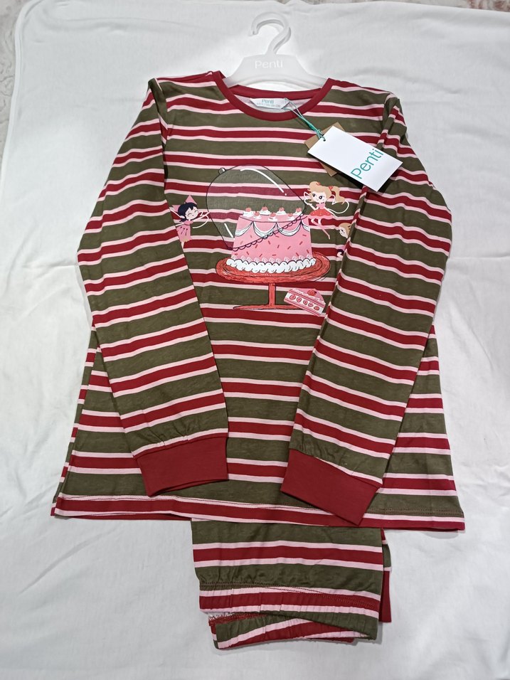 Kız çocuklar için uzun kollu, yuvarlak yaka ve yumuşak örme kumaştan yapılmış pijama takımı. Renkli çizgiler ve önde pasta baskısı bulunur.