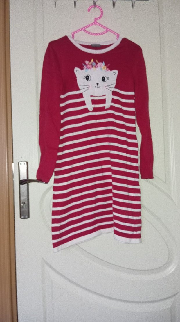 Renkli kırmızı ve beyaz çizgili, uzun kollu, bisiklet yaka, triko örme kız çocuk elbisesi. Önünde sevimli kedi deseni bulunur.