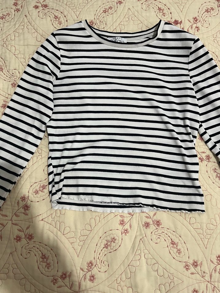 Kız çocuk için, triko kumaştan yapılmış, çizgili ve uzun kollu, oturan kesim beyaz tişört. Salaş ve rahat bir sokak stili parçası.