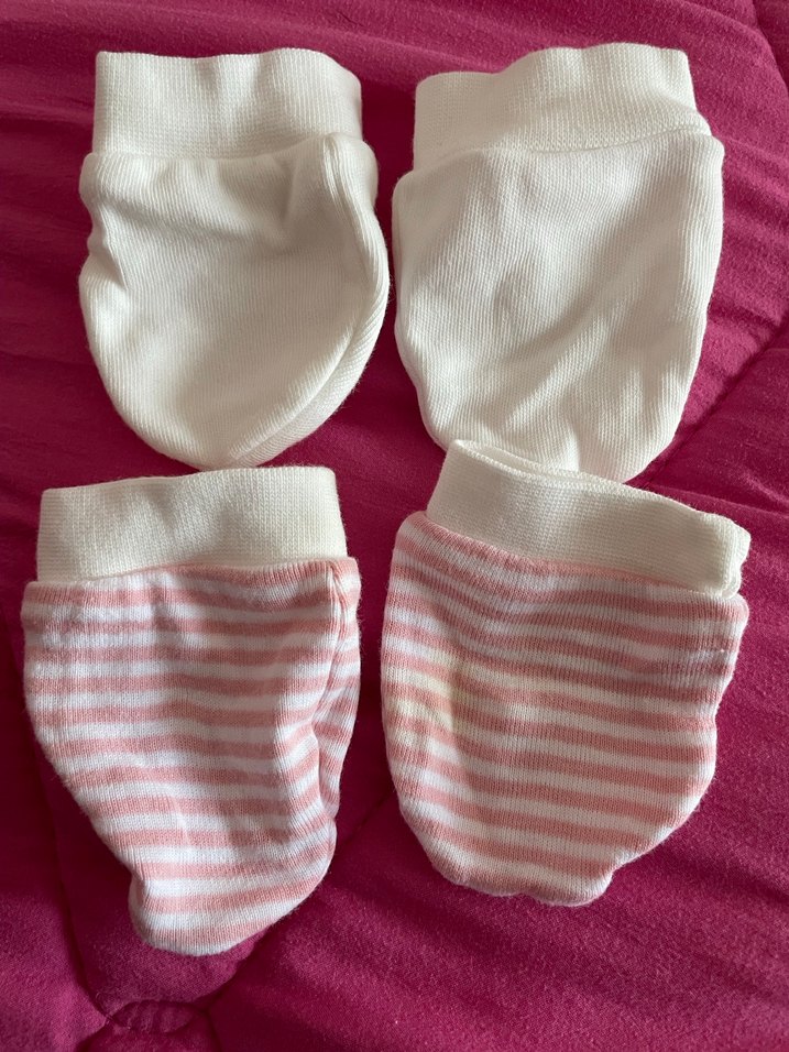 Pastel pembe ve beyaz renklerde, düz ve çizgili örme kız çocuk eldivenleri. Yumuşak ve sıcak dokuda kumaştan üretilmiştir.