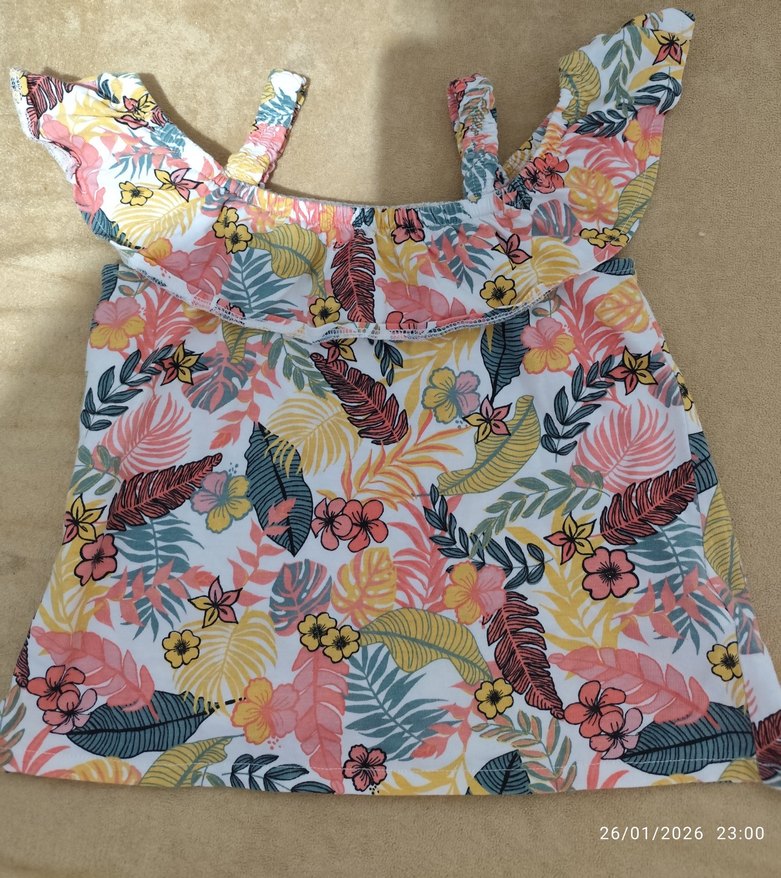 Askılı, straplez yaka ve fırfırlı detaylara sahip, bol kesim kız çocuk bluzudur. Pastel çok renkli baskılı, yumuşak penye kumaştan üretilmiştir.