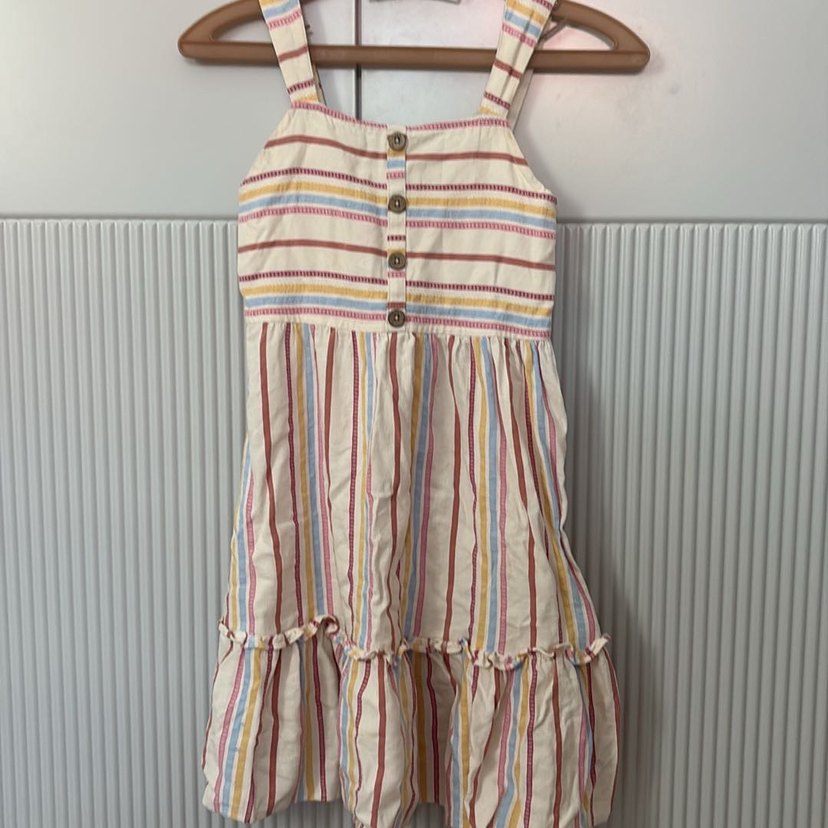 Çok renkli pastel çizgili, askılı ve düğmeli ön detaylı, fırfırlı ve bol kesim kız çocuk elbisesi. Yumuşak tekstil kumaştan yapılmıştır.