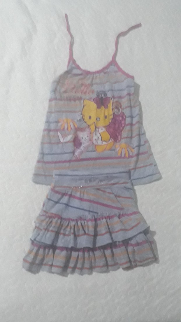 Çok renkli pastel çizgili ve sevimli baskılı karakterlere sahip, askısız yaka ve fırfır detaylı bol kesim kolsuz elbise ve etek takımı.