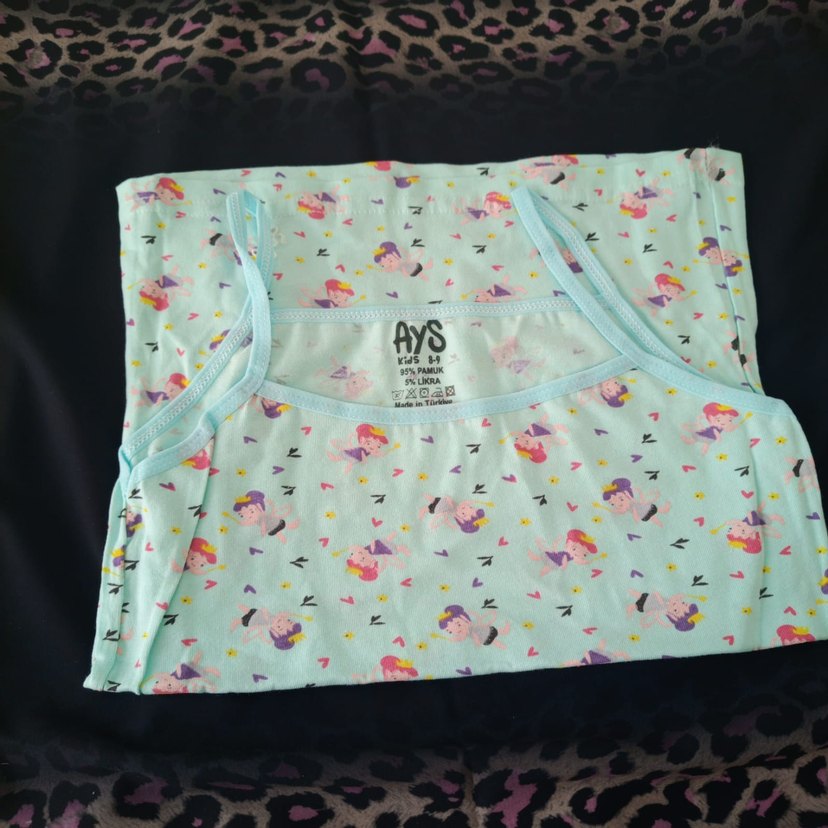 Kız çocukları için askılı, çok renkli baskılı ve fırfırlı, sentetik yumuşak kumaştan üretilmiş dar kesim atlet.