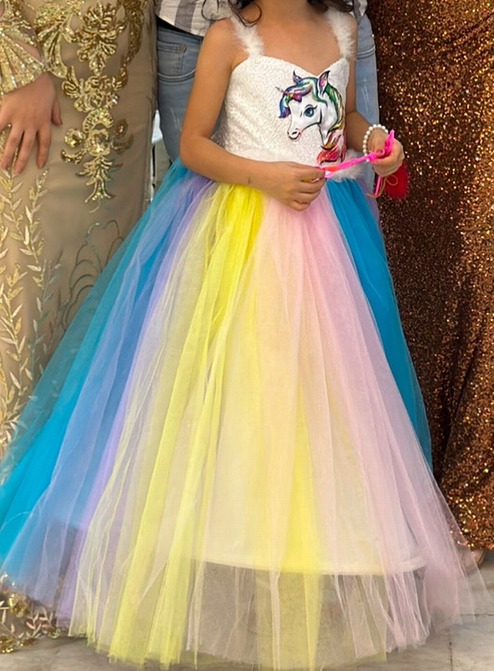 Askısız yaka ve boncuk detaylı, çok renkli tie-dye etekli, sentetik kumaştan yapılmış kız çocuk elbisesi.