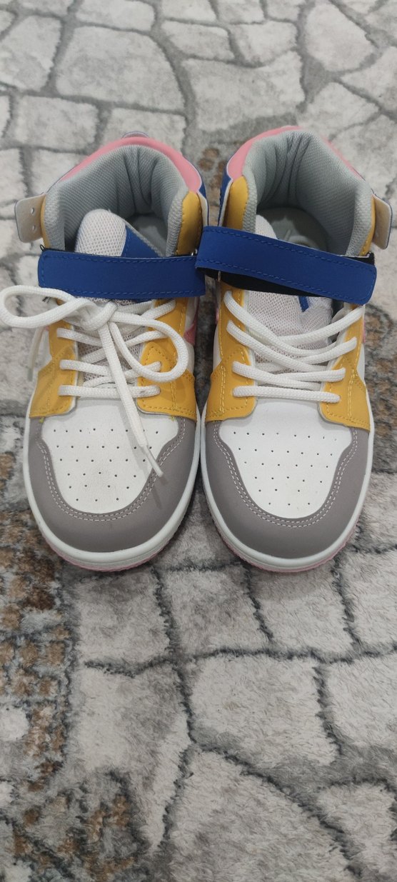 Gri, sarı ve mavi detaylı bağcıklı ve cırt cırtlı çok renkli kız çocuk spor ayakkabısı, kauçuk tabanlı ve bağcıklı.