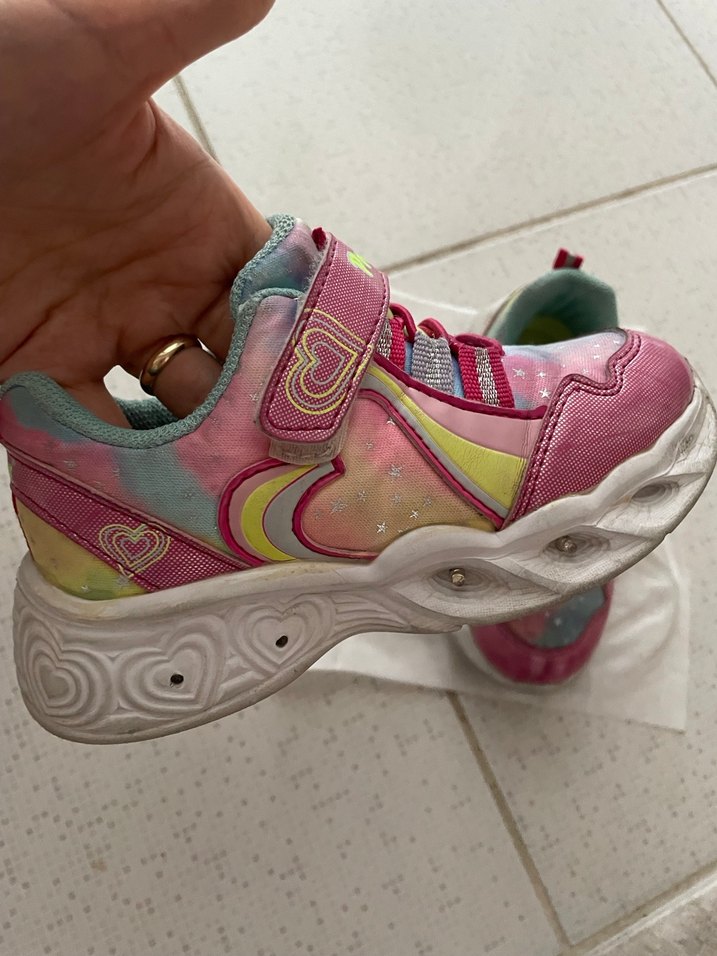 Kız çocukları için çok renkli batik desenli, kauçuk tabanlı ve kolay giyilen cırt cırtlı spor ayakkabılar. Işıkları çalışmıyor ancak yırtığı yok