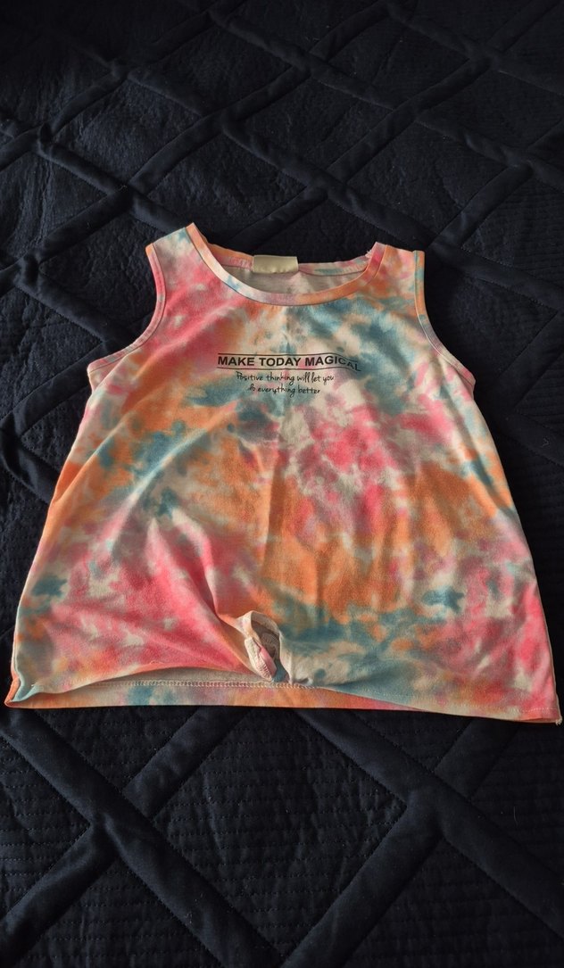 Kız çocukları için pastel renklerde bağlama desenli, askısız ve bol kesim tişört. "MAKE TODAY MAGI" yazılı, zahmetsiz şıklık sunar.