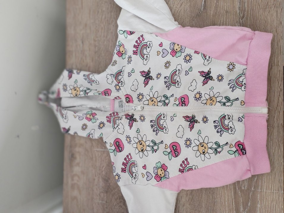 Kız çocukları için uzun kollu, V yakalı, pastel çok renkli baskılıyumuşak sentetik kumaştan, kolay giyilmesi için fermuarlı.