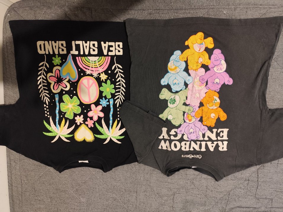 Pamuklu kumaştan, bol kesim, baskılı ve çok renkli bohem tarzda kız çocuk kısa kollu tişörtler.