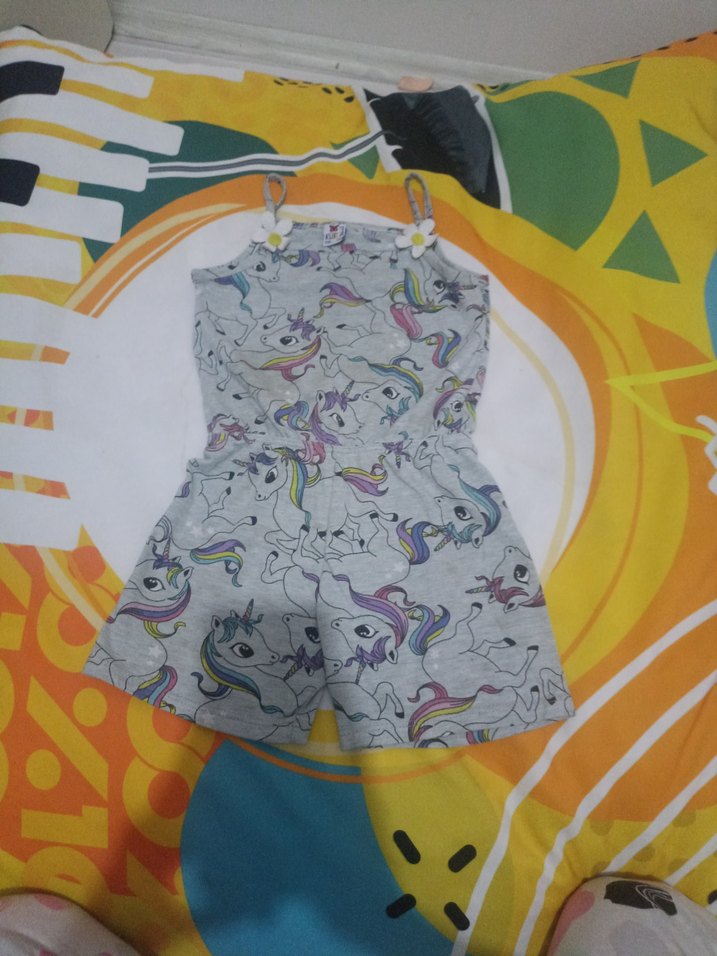 Kolsuz, straplez yaka ve fırfırlı detaylara sahip kız çocuk elbisesi. Yumuşak sentetik kumaştan, gri zemin üzerine renkli unicorn baskılı, trend sokak tarzı için uygun.