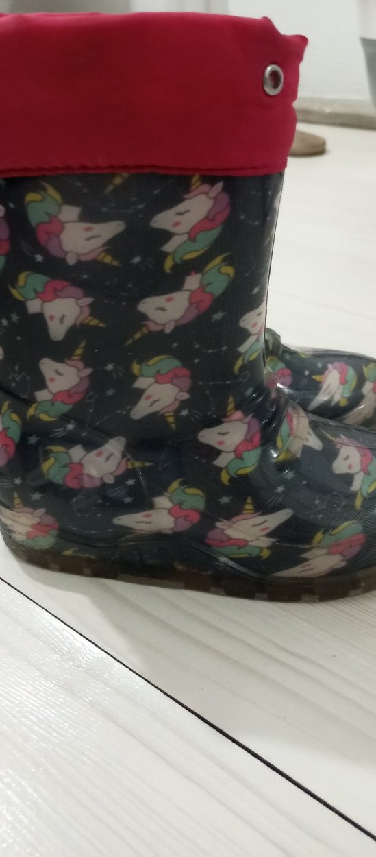 Kız çocukları için koyu renkli lastik botlar, çok renkli unicorn baskısı ve tokalı tasarımıyla pop kültür tarzını yansıtıyor.