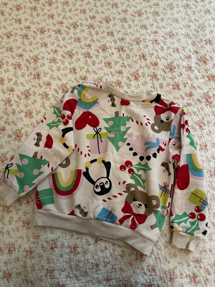 Kız çocukları için yumuşak ve örme dokulu, bol kesim çok renkli baskılı sweatshirt. Uzun kollu ve yuvarlak yakalı, rahat sokak stili için uygun.