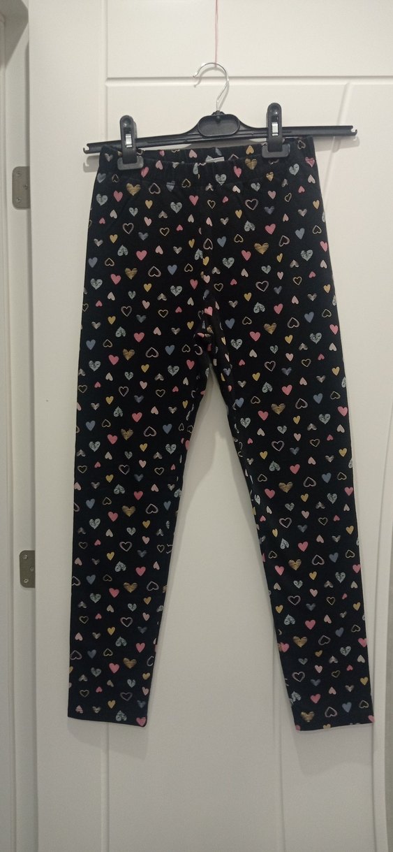 Kız çocukları için çok renkli kalp baskılı, elastik belli ve yumuşak orta kalinlikta kumaştan yapılmış dar kesim tayt. çok az giyildi alana hayırlı olsun.
