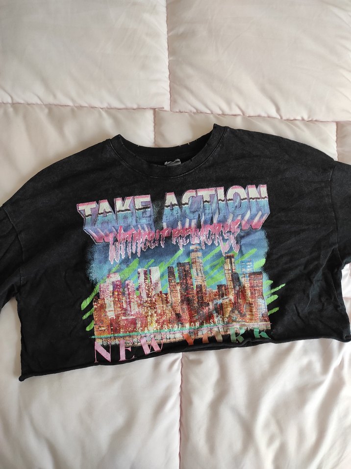 Pamuk kumaştan, kısa kollu ve bol kesim kız çocuk tişörtü. Çok renkli baskılı şehir manzarası ve rock punk tarzı yansıtıyor.