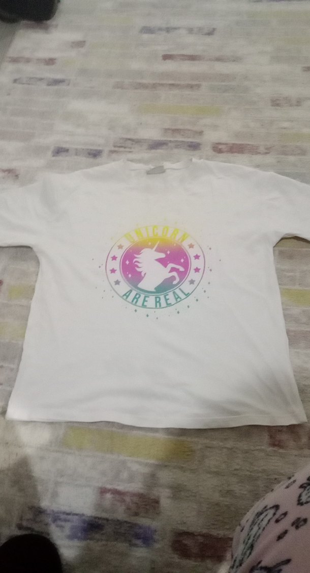 Pamuklu, bol kesim, kısa kollu ve bisiklet yaka kız çocuk tişörtü. Pastel çok renkli unicorn baskısı ve 'UNICORN ARE REAL' yazısı bulunur. tişört temiz sağlam