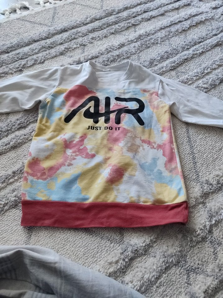 Pamuk kumaştan yapılmış, bol kesim, uzun kollu ve yuvarlak yakalı kız çocuk tişörtü. Pastel çok renkli batik deseni ve baskılı ön yüzü ile dikkat çeker.