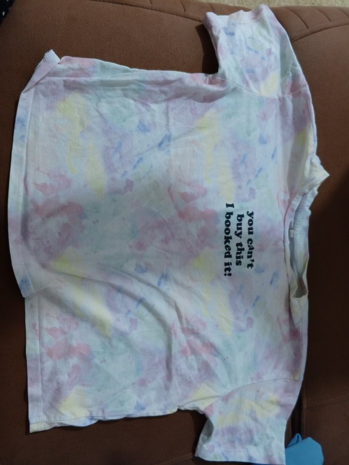 Kız çocuk çok renkli batik desenli T-shirt, kısa kollu ve yuvarlak yakalıdır. Pamuk kumaştan üretilmiş, rahat ve bol kesimdir. Önünde 'you can't buy this, I booked it!' yazısı bulunur. S BEDEN