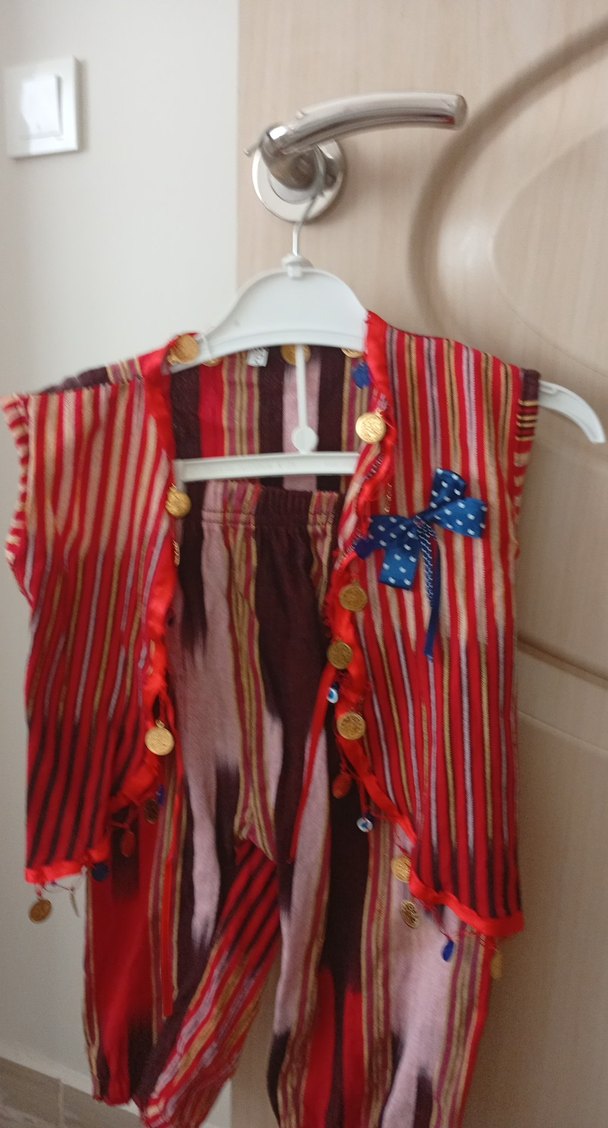 Çok renkli, düğmeli ve küçük fiyonk detaylı, bol kesim, yakası kesik kız çocuk yeleği. Bohem tarzda, batik ve çizgili tekstil kumaşından.