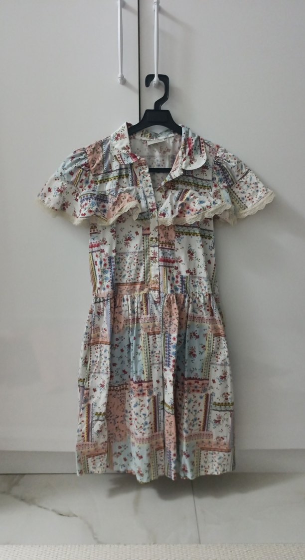 Kız çocuk elbisesi, bol kesim, kısa kollu ve yakalıdır. Canlı pastel çok renkli desenli, fırfır detaylı ve yumuşak tekstil kumaştandır.