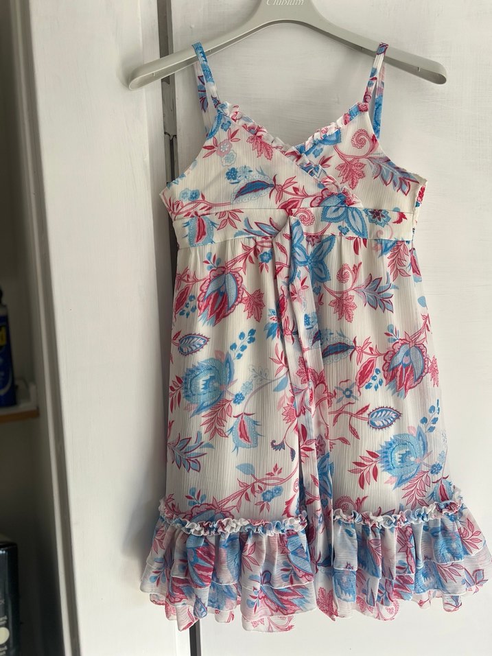 Askısız, çok renkli tie-dye desenli bohem elbise. Yumuşak sentetik kumaştan, straplez yaka ve bol kesim, fırfır detaylıdır. 114 cm dir