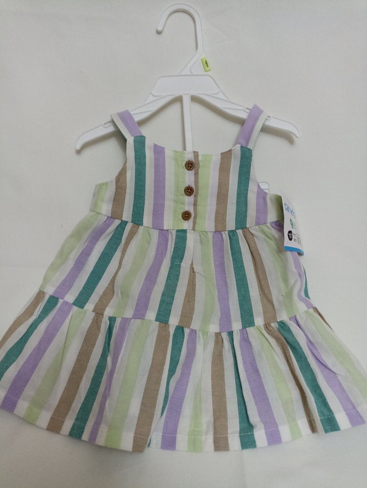 Kız çocukları için çok renkli pastel çizgili, düğmeli, askılı, bol kesim bohem elbise. Yumuşak pamuk kumaştan yapılmıştır. 3 aylık etiketlidir