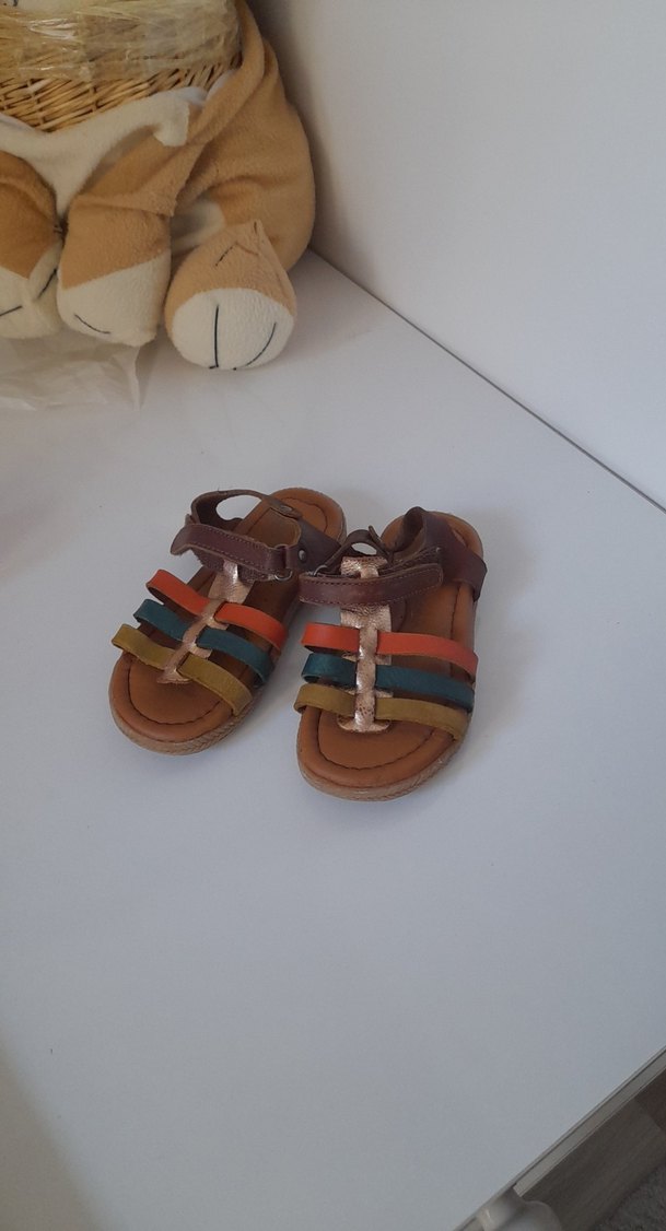 Kız çocukları için tokalı, çok renkli bohem tarzda, kauçuk malzemeden yapılmış sandalet. Retro görünüm için koyu tie-dye deseni içerir. yüzde yüz deridir çok az giyebildik numaramız yaza pek yetişmedi aşırı tarz bir ürün