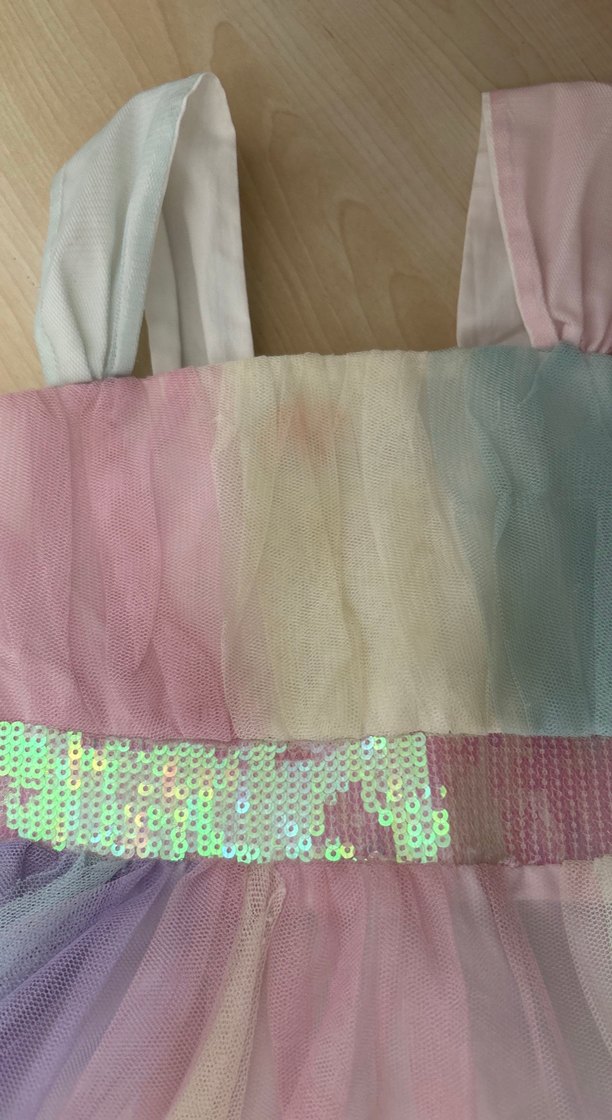 Bohem tarzda, çok renkli pastel tonlarda, straplez yaka ve fırfır detaylı kız çocuk elbisesi. Hafif ve yumuşak sentetik kumaştan, simli beliyle dikkat çekiyor.