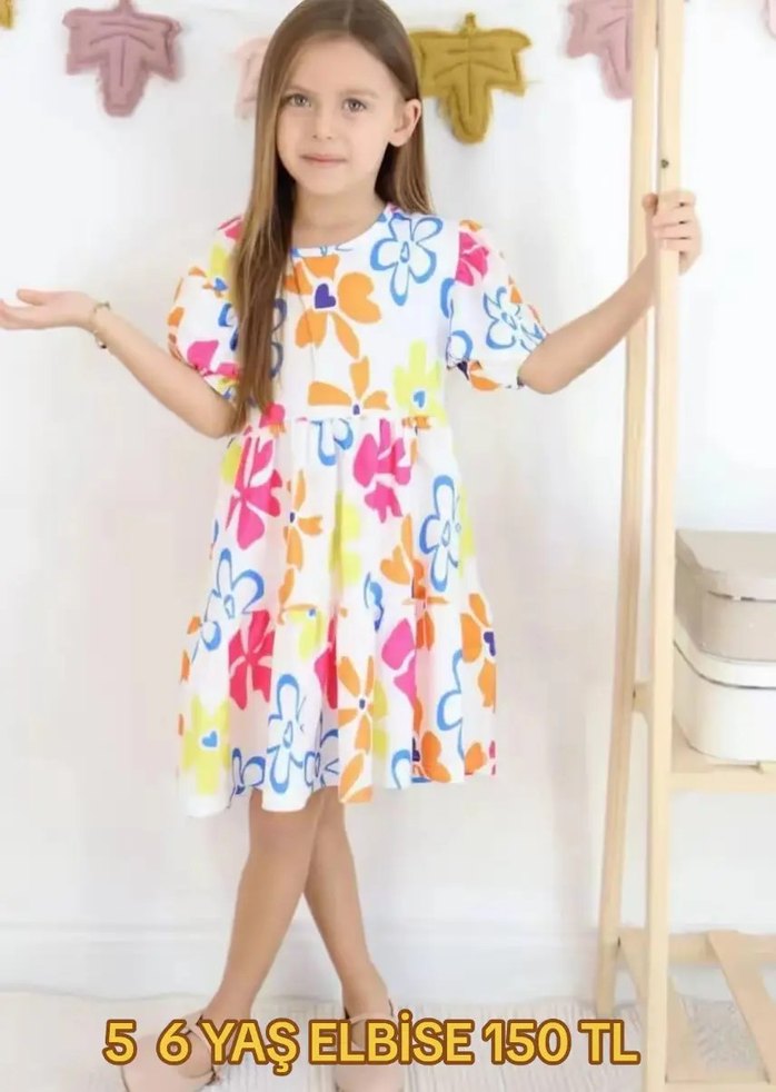 Kız çocuk elbisesi, bol kesim, kısa kollu ve renkli çiçek desenlidir. Yumuşak pamuktan üretilmiş, elastik bel ve straplez yaka detayına sahiptir.