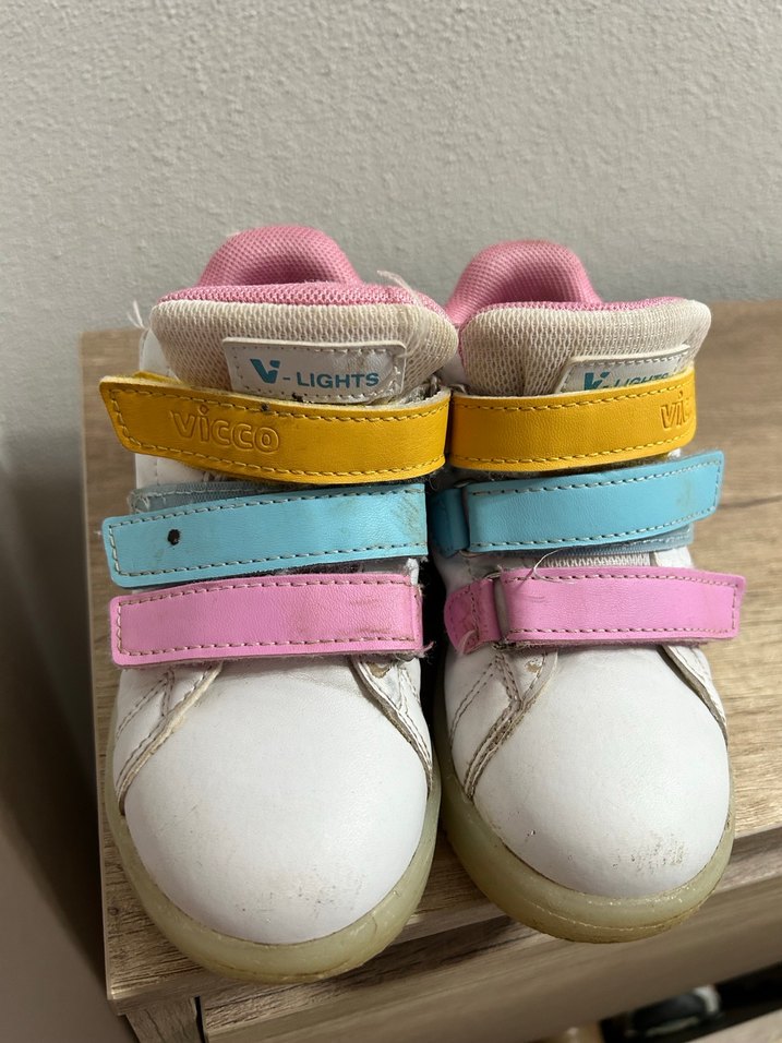 Bu kız çocuk spor ayakkabıları, kolay kapanan sarı, mavi ve pembe pastel renkli cırt cırtlı bantlara sahiptir. Kauçuk tabanlı, desen içermeyen sade bir tasarıma sahiptir.