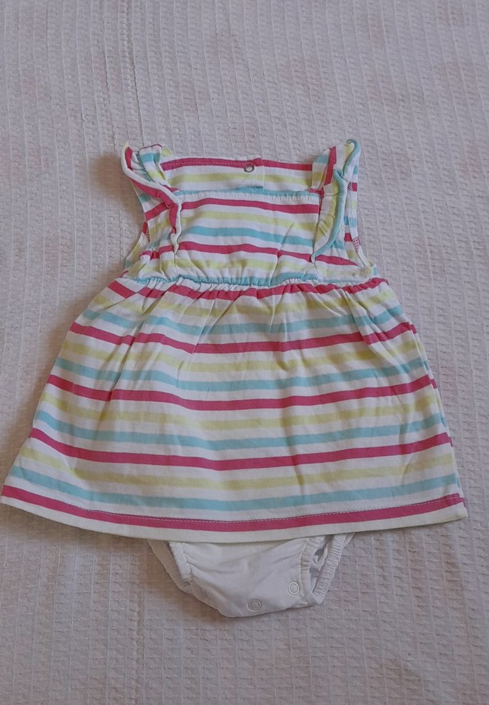 Kız çocuk için kolsuz, çok renkli pastel çizgili ve fırfırlı elbise. Straplez yaka ve sentetik kumaştan, bohem tarzda şık bir model.