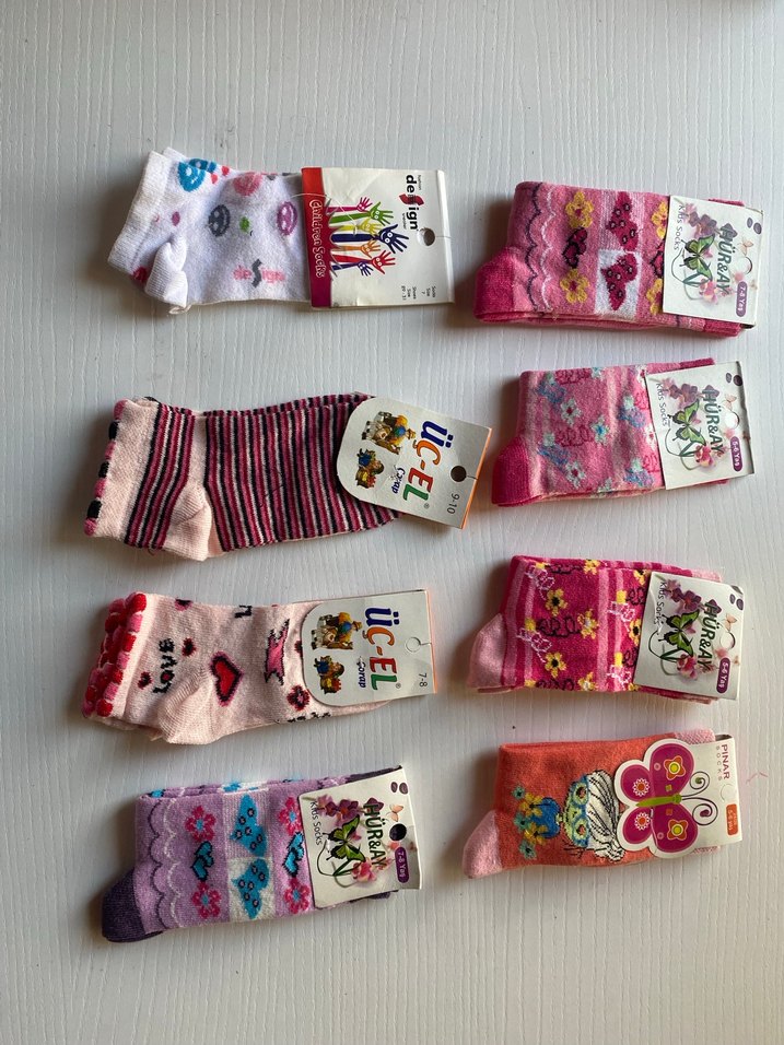 Yumuşak tekstil malzemeden yapılmış, kız çocuklar için çok renkli nakışlı çoraplar. Farklı desenler ve canlı renkler içerir. Sıfır ürün, uygun fiyat. Fiyat 8 ürün için geçerlidir