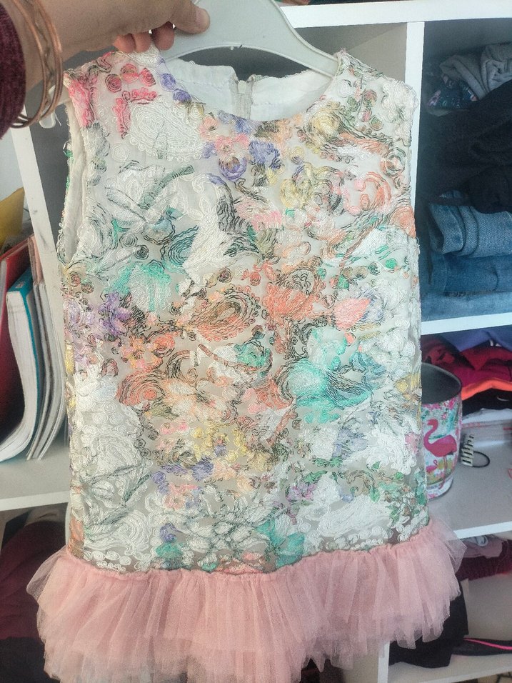 Kız çocukları için dantelli, çok renkli pastel çiçek desenli, kolsuz elbise. Bohem tarzda, yuvarlak yaka ve bol kesim, tül etek ucu ile tamamlanmıştır.