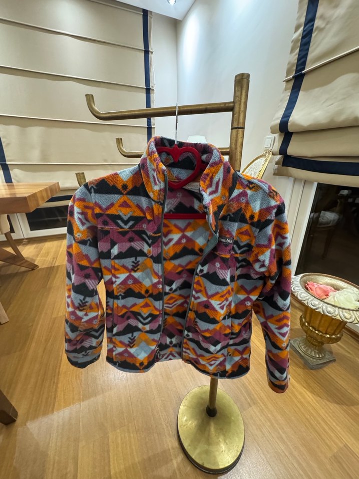 Düğmeli ve yüksek yakalı, çok renkli desenli, yumuşak ve sıcak kumaştan yapılmış kız çocuk ceket. Bohem tarzı için uygun.