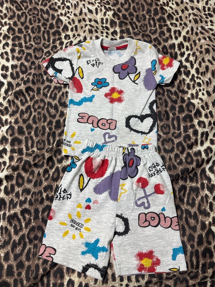Bol kesim, çok renkli desenlere sahip kısa kollu tişört ve şorttan oluşan kız çocuk takımı. Rahat sentetik kumaştan yapılmıştır.