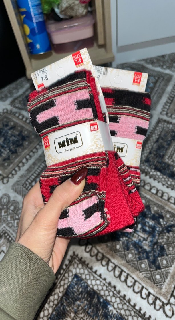 7-8 yaş ikisi beraber satıyorum. Kız çocukları için çok renkli, koyu tonlarda desenli triko çoraplar, pembe, kırmızı ve siyah renklerle canlı bir görünüm sağlar.