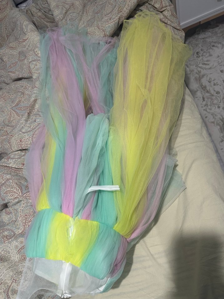 Çok renkli, pastel tonlarda kuyruklu kız çocuk tütülü elbise, yumuşak sentetik kumaştan bohem bir tarz sunar.
