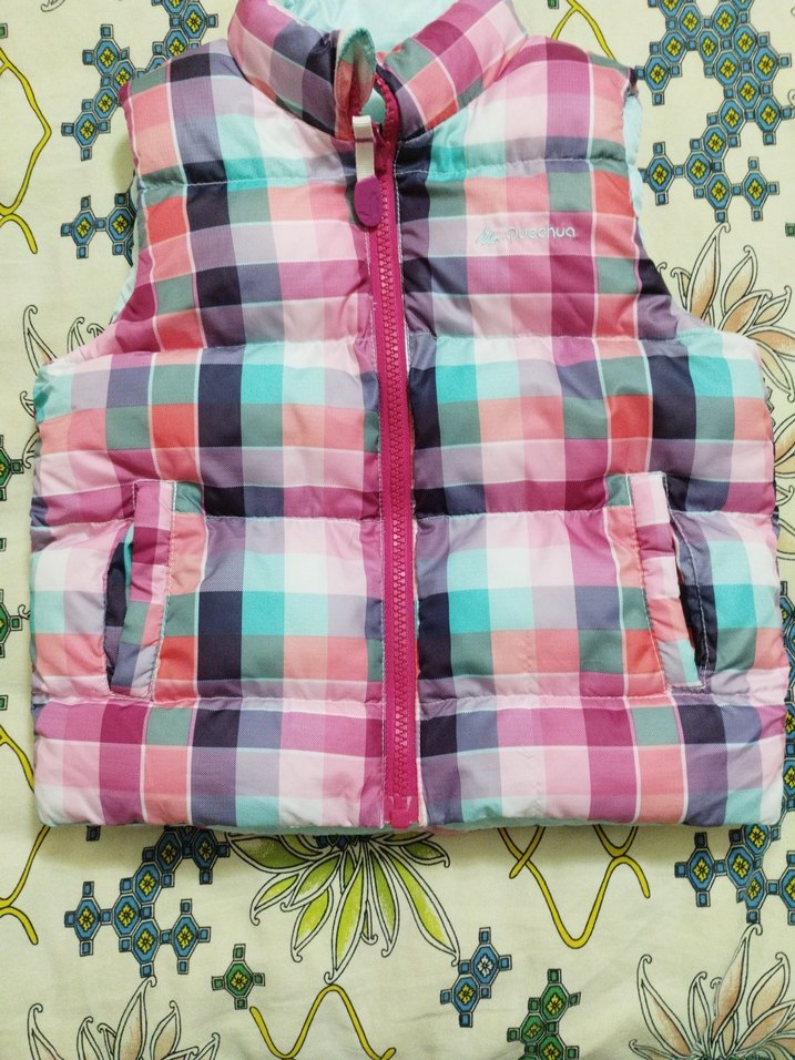 Kız çocukları için renkli kareli desenli, fermuarlı ve cepli, straplez yaka, dar kesim yelek. Yumuşak sentetik kumaştan üretilmiştir. çift taraflı kullanılıyor erkek çocuğa da olur