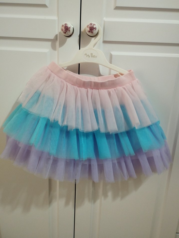 Yumuşak sentetik kumaştan yapılmış, çok renkli pastel tonlarda, katmanlı fırfırlı ve dar kesim kız çocuk eteği.