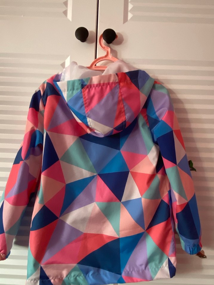 Kız çocuk yağmurluğu, bol kesim, çok renkli geometrik desenli. V yaka, kapüşonlu ve fermuarlı, sokak modasına uygun.