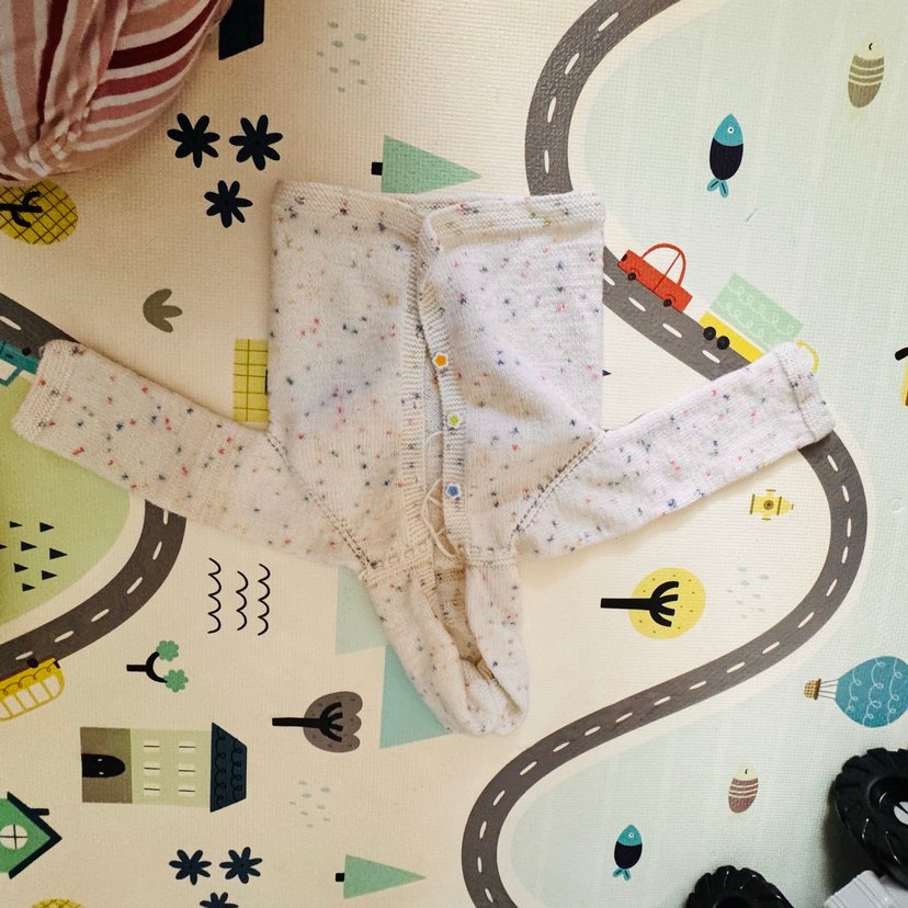 Bu ince triko kız çocuk hırkası, uzun kollu ve vücuda oturan kesime sahiptir. Açık renkte olup çok renkli benekler ve renkli düğmelerle süslenmiştir. el örgüsü hiç kullanılmamıştır