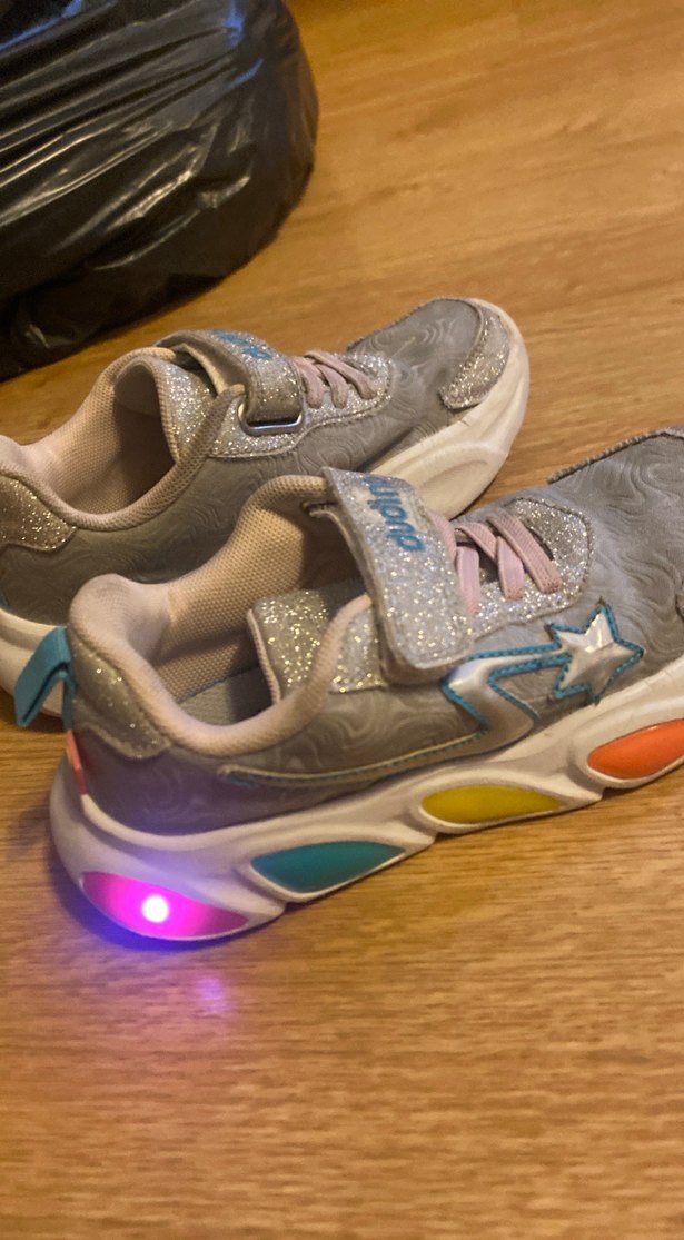 Boyner’den aldık çok giymedi yıkamadım silmedim ışıklarını yanıyor, öndeki şimleri az dökülmüş resimde göründüğü gibi ….. Kız çocukları için çok renkli baskılı spor ayakkabılar, kolay kapanan cırt cırtlı bantlarla. Kauçuk tabanlı, hafif ve sokak tarzı. Ayakkabılardan biri renkli LED ışıkla parlıyor.✨