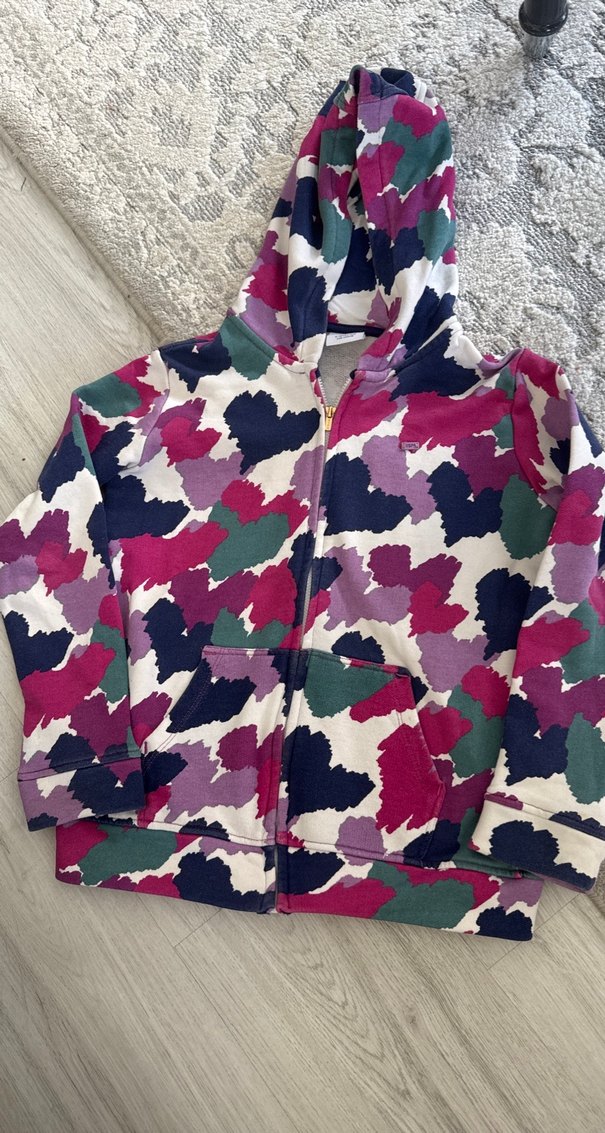 Kız çocuklar için kapüşonlu, fermuarlı, çok renkli kamuflaj desenli sweatshirt. Uzun kollu ve bol kesim, yumuşak ve sıcak kumaştan üretilmiştir.