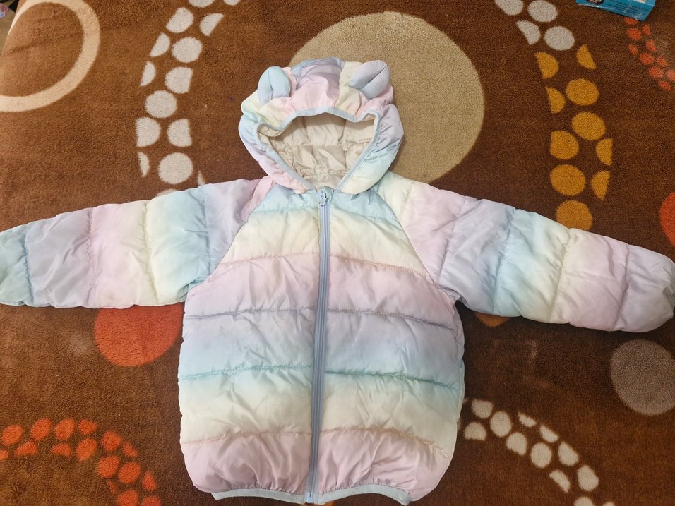 Kız çocukları için pastel tonlarda batik desenli, kapüşonlu ve kulak detaylı, yumuşak ve sıcak kumaştan yapılmış monttur. ufak lekeleri mevcut fiyata yansittim yurtdiisndan alindi