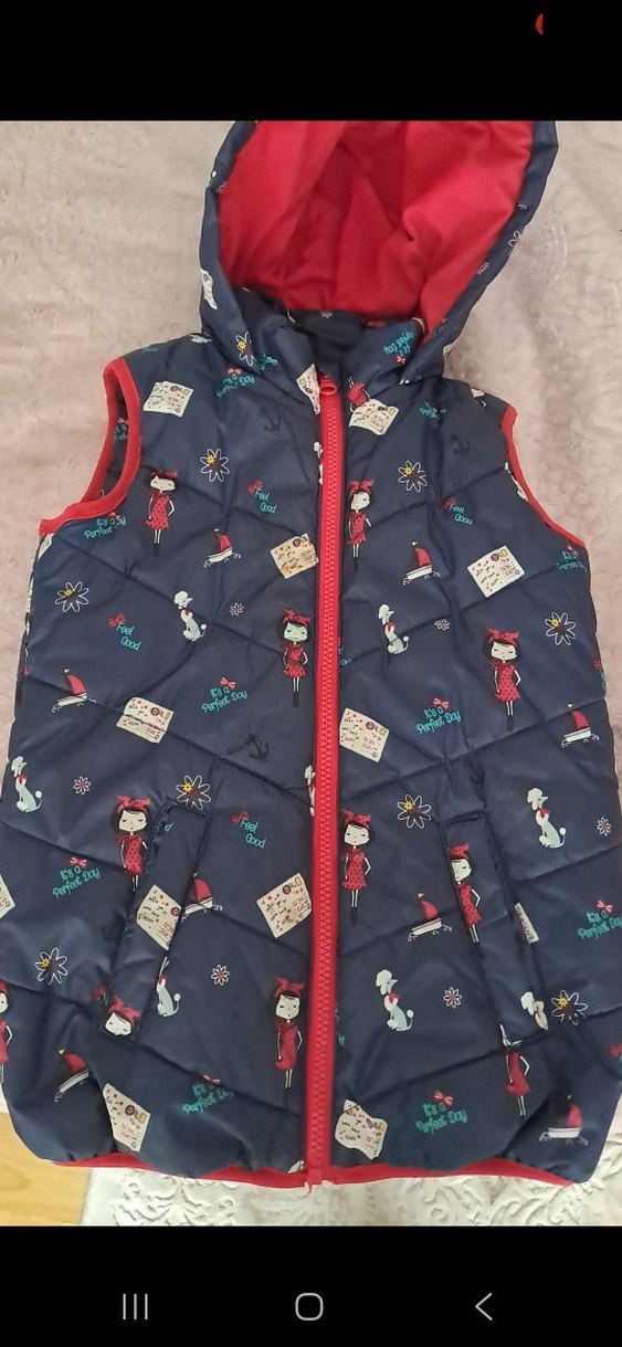 Kız çocukları için yüksek yakalı, fermuarlı ve çok renkli baskılı desenlere sahip, sentetik kumaştan sleeveless yelek. Sokak stilinde, trend ve rahat bir model.