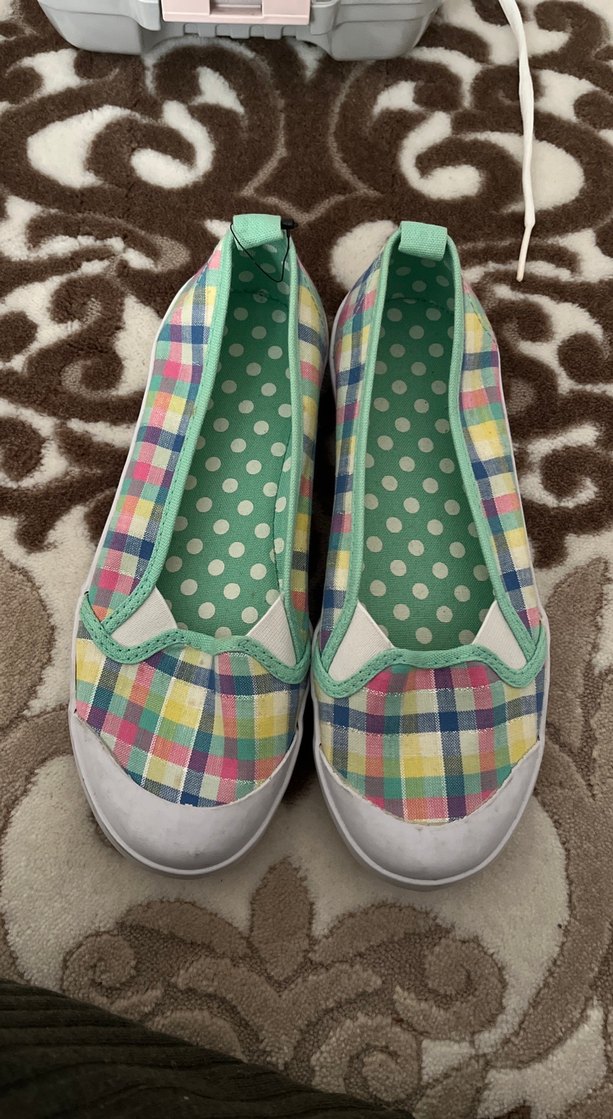 Kız çocukları için çok renkli kareli desenli, yeşil puantiyeli iç tabanlı sentetik kumaş babet. Düğmeli ve sokak stiline uygun.
