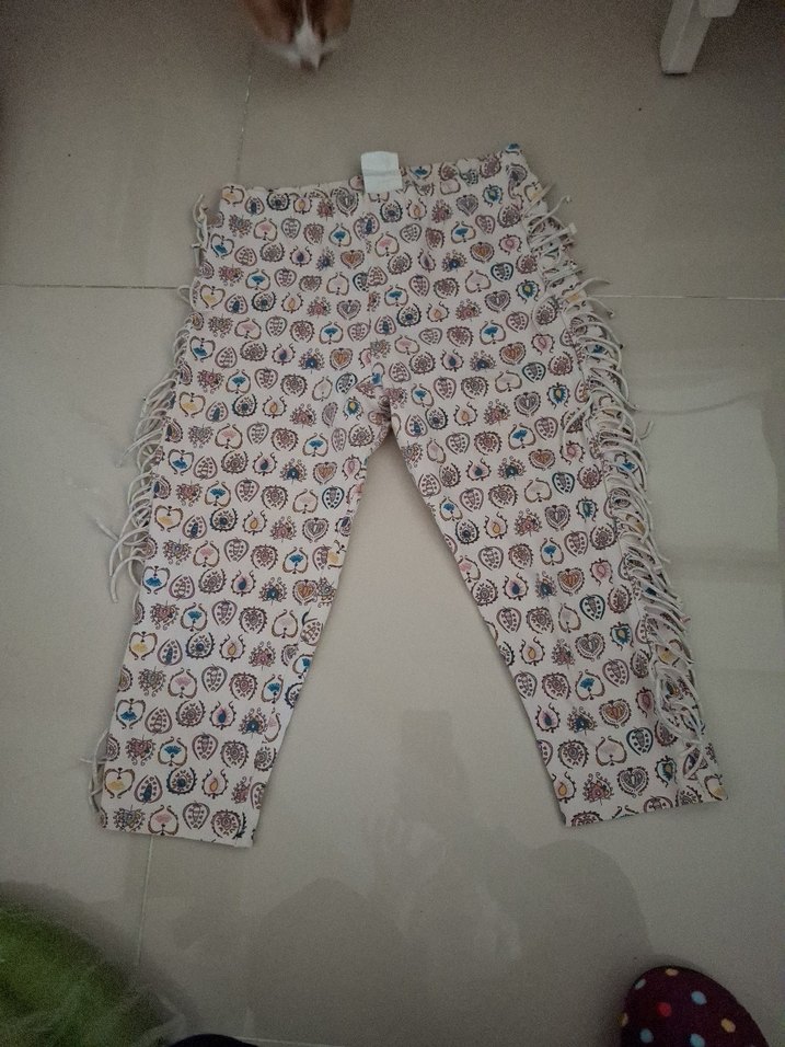 Kız çocuk çok renkli, pastel tonlarda kenarları püskül detaylı pantolon