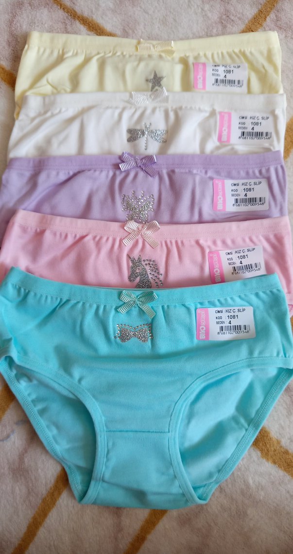 Çocuklar çin pastel tonlarda, yumuşak kumaştan yapılmış 5'li külot seti. Her parçada küçük fiyonk ve taşlı detay bulunur, rahat normal boyda ve konforludur.