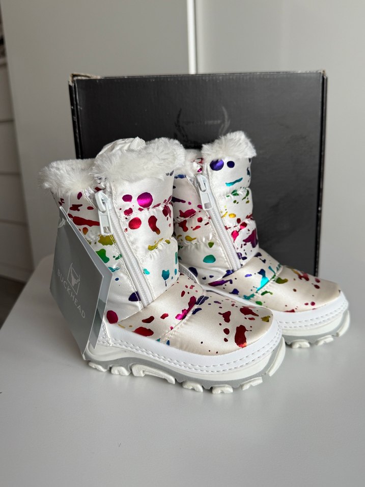 Kız çocukları için çok renkli batik desenli, kürklü detaylı kauçuk botlar. Ön fermuarlı, pop kültür tarzında tasarlanmıştır.