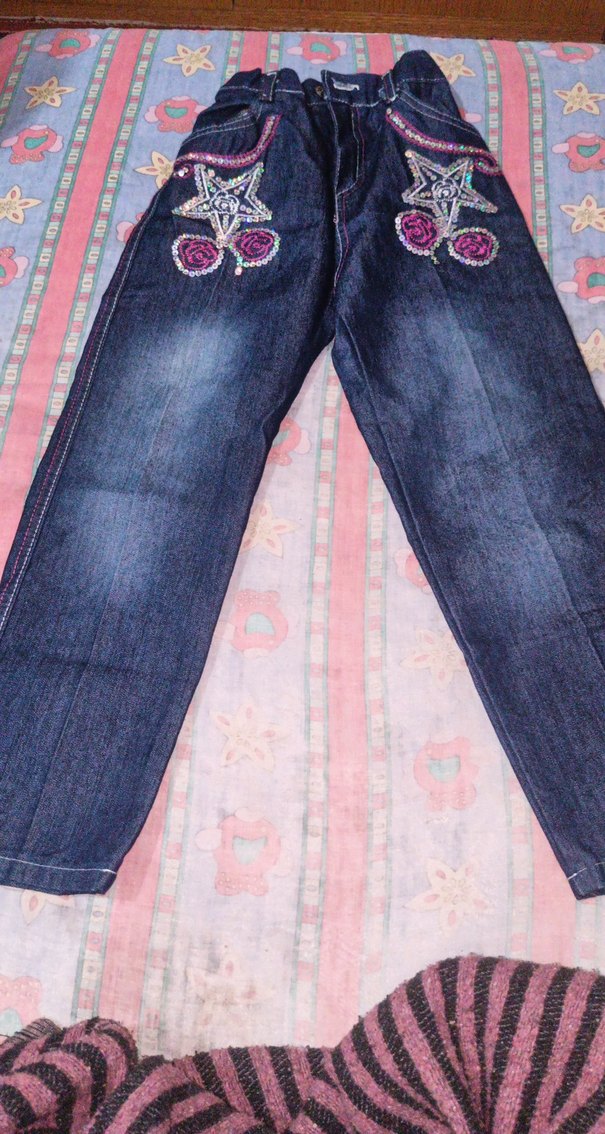 Kız çocuklar için çok renkli nakışlı ve payet detaylı, regular fit denim pantolon. Trend sokak stili için uygundur.